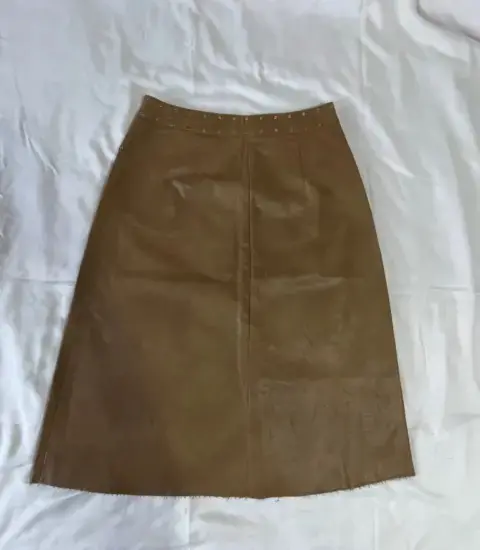 Falda café, imitación piel, con botones dorados, bolsas al frente.