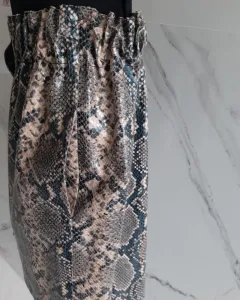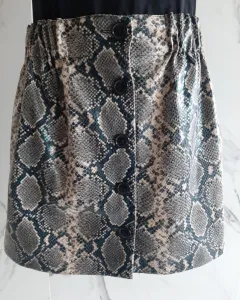 Falda corta con estampado de vibora, tela tipo piel, con bolsas laterales y resorte en la parte de la cintura. Tiene botones en la parte de enfrente y se amolda muy bien al cuerpo. *INCLUYE EL COLLAR (dependiendo del costo)