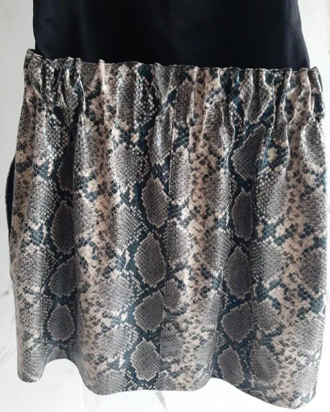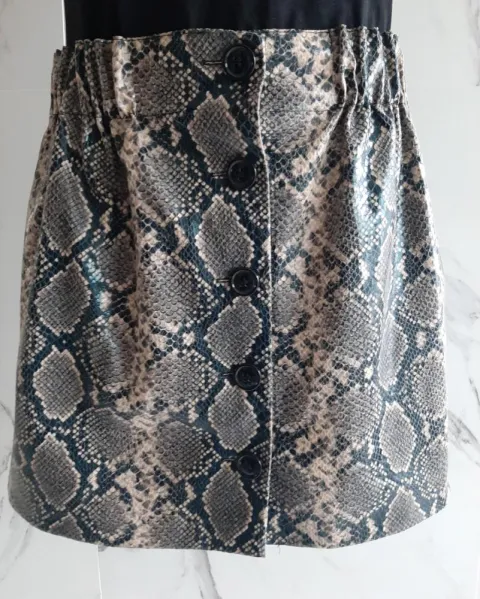 Falda ZARA corta. Falda corta con estampado de vibora, tela tipo piel, con bolsas laterales y resorte en la parte de la cintura. Tiene botones en la parte de enfrente y se amolda muy bien al cuerpo. *INCLUYE EL COLLAR (dependiendo del costo)