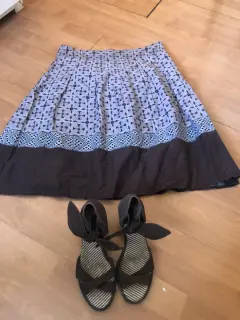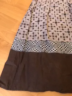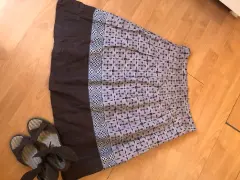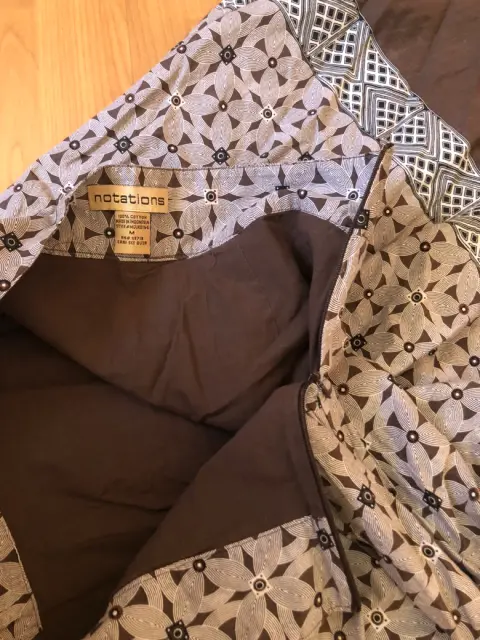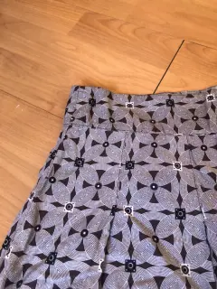 Falta de figuras Talla M. Linda Falda Talla M, holgada de figuras café con crema, tiene forro en la parte interior, queda a la altura de las rodillas, tiene prédica y cierre oculto