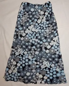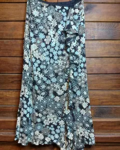 Linda falda floreada. Hemosa falda de flores color azul claro con blanco y negro, forrada la tela estira, es muy cómoda con resorte en la cintura y un olán hermos en frente hacia un lado llega a la rodilla, está hermosa la tela!