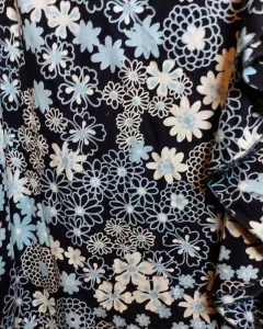 Hemosa falda de flores color azul claro con blanco y negro, forrada la tela estira, es muy cómoda con resorte en la cintura y un olán hermos en frente hacia un lado llega a la rodilla, está hermosa la tela!