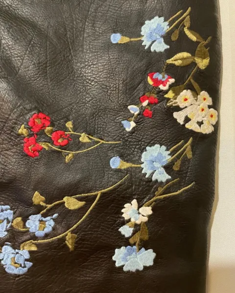 Linda Falda cuero sintético ideal para un look urbano o casual ,,con suave bordados de flores