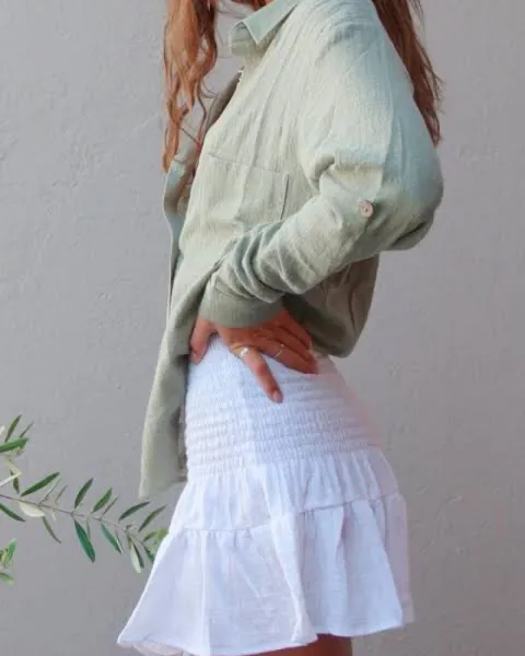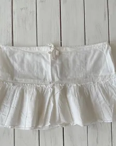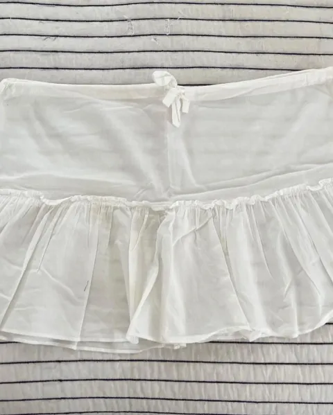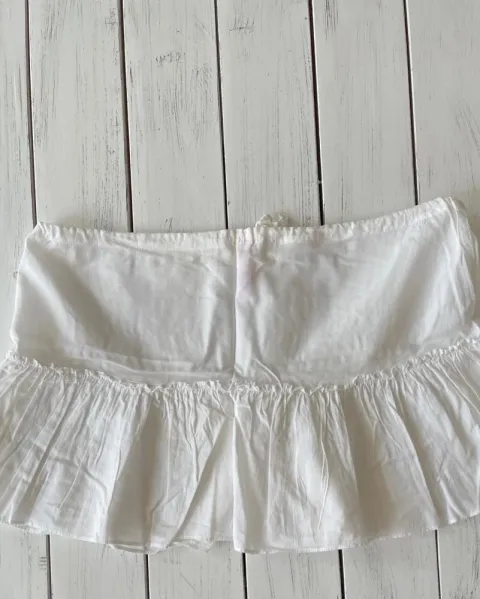 Mini falda blanca con jareta. Talla: XS, tiene cinta para ajustar, así como está mide 43 cm de cintura/cadera y 31 cm de largo. Es 100% algodón. Muy fresca y se transparenta, ya que la tela es delagada.