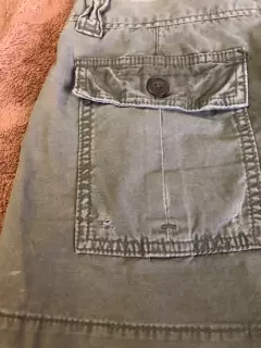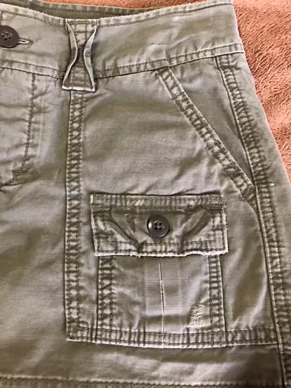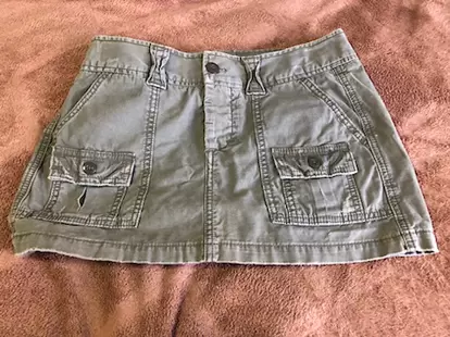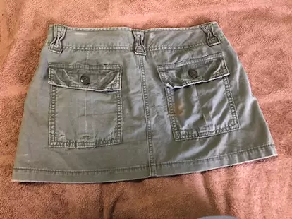 Mini falda color verde soldado. Bellísima mini falda, talla 0, está nueva con etiqueta, solo que no me fijé que tiene unas tonalidades rojizas cerca de los bolsos (casi no se notan) pero en el bolsillo derecho de la parte trasera si se nota, como lo muestra la foto.