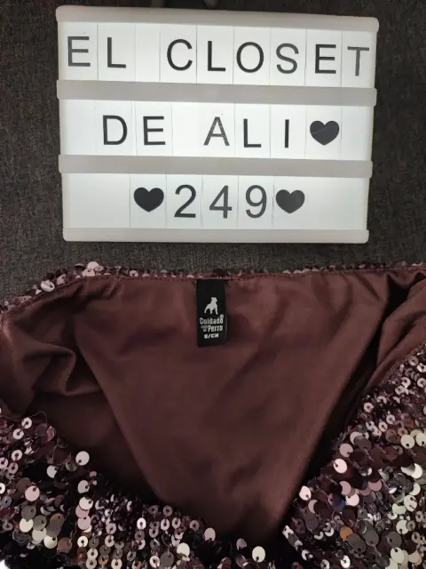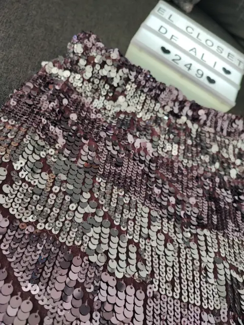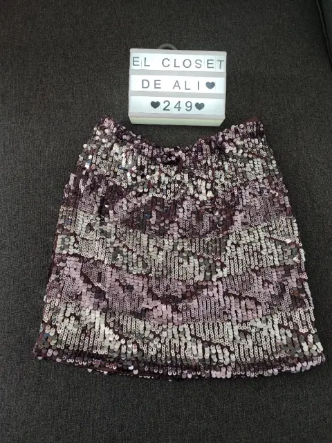Preciosa mini falda de lentejuela de color morado y plata 💜Marca: Cuidado con el perroTalla S (strech)Cintura: 35cmCadera: 40 cmLargo: 47 cm