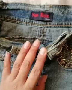 Bonita minifalda de mezclilla tiene como diamantitos en las bolsas. Orma super bonita pegadita al cuerpo, le falta un estoperol de un lado perseptible