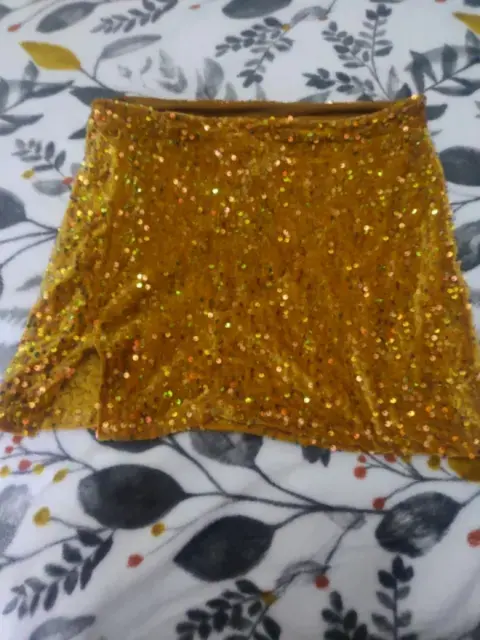 Mini falda lentejuelas dorada. Mini falda abertura al frente. Lentejuelas doradas Tela que se estira Forrada