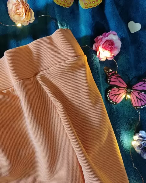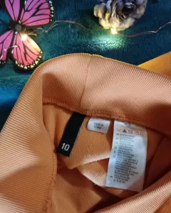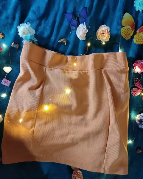 Linda mini falda color coral clarito, talla mediana- grande, tela gruesa, marca DIVIDED, 97 por ciento polyester, 3 elastano.Envío de lunes a sábado.
