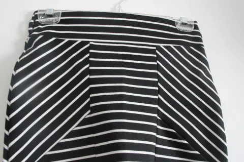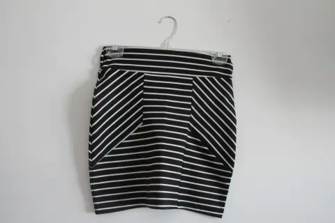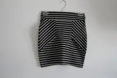Falda de camiseta, rayas blanco y negro. Una puesta, tiene presillas para cinturón, mide 34cm de cintura sin estirar y modo plano, de largo 40cmMarca Tierra bendita, talla S.