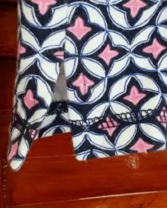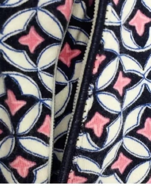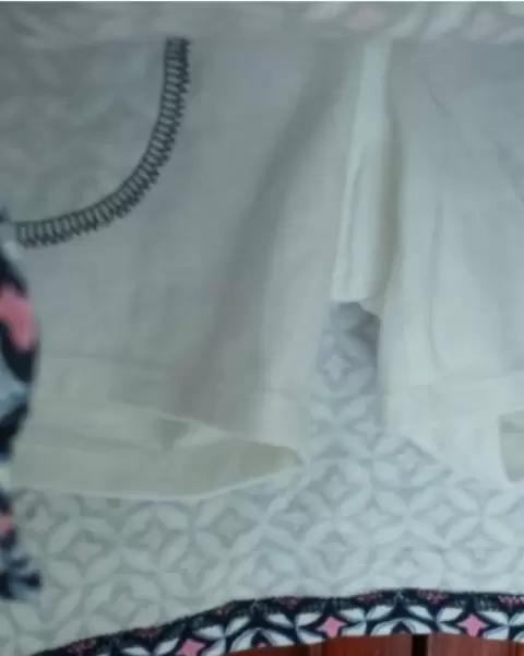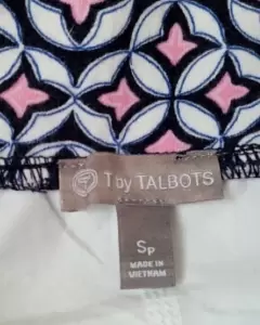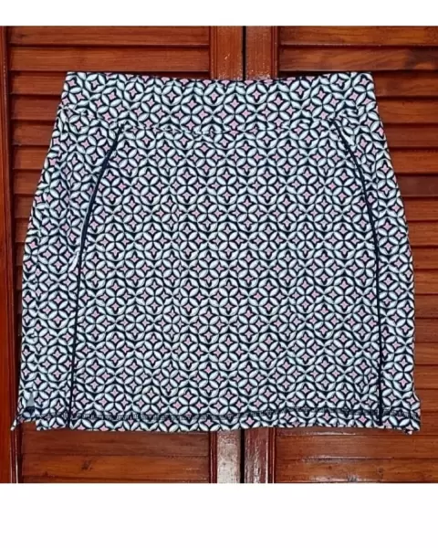 Bonita falda strech blanca con estampado de figuras geometricas en rosa y azulmarino, tiene aberturas pequeñas a los lados y cierre en bolsas laterales, su pretina es ancha de resorte y tiene integradas unas libras por debajo