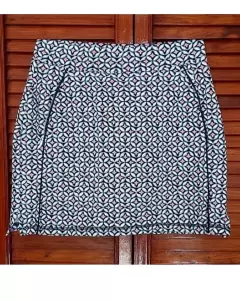Minifalda. Bonita falda strech blanca con estampado de figuras geometricas en rosa y azulmarino, tiene aberturas pequeñas a los lados y cierre en bolsas laterales, su pretina es ancha de resorte y tiene integradas unas libras por debajo