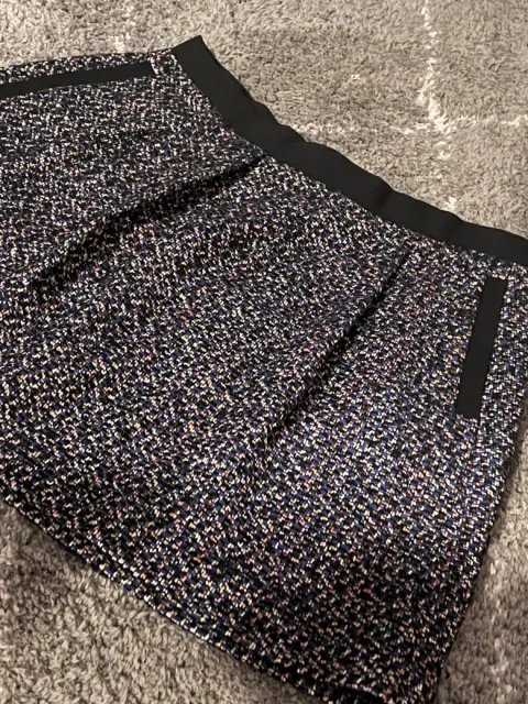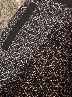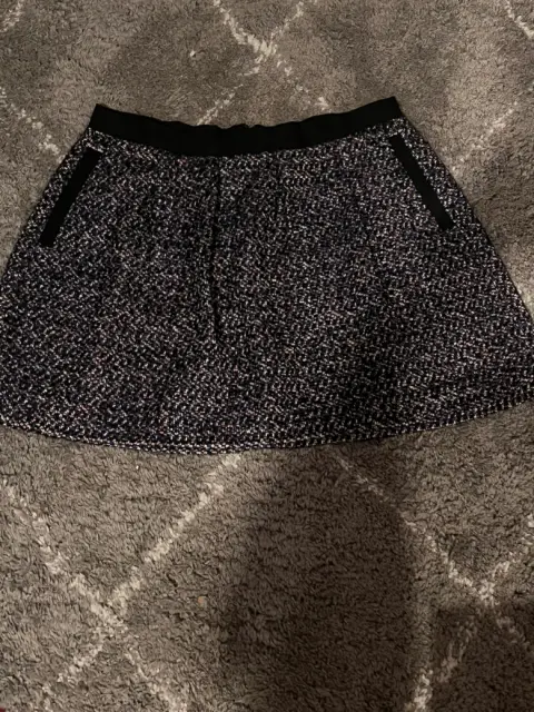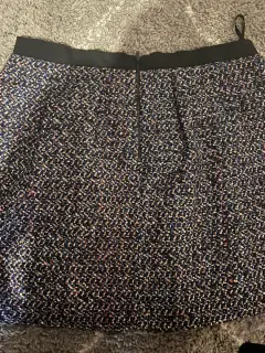 Hermosa minifalda jaspeada azul. Tiene cierre en la parte de atrás. Tiene bolsitas. La tela es gruesa y suavecita. Medidas cintura 40 cm, cadera 56 cm, largo 44 cm.