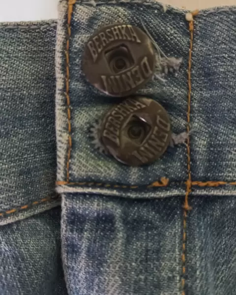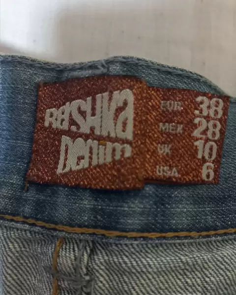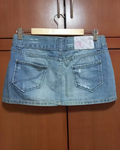 Minifalda de mezclilla deslavada, talla 28, corte a la cadera, medida de lado a lado 42 cm, puesta una vez.