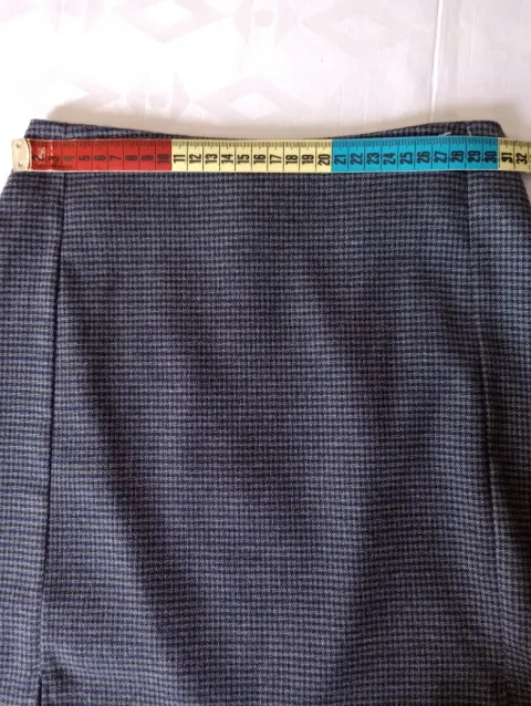 Minifalda John Galt, talla XS, de poliéster, viscosa y espándex, en excelentes condiciones, con cierre posterior. Color gris con detalles en negro y azul marino. Mide 31 cm de cintura y 42 cm de largo.