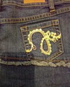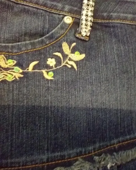 Denim,strech,bordada,tablitas a un costado,encaje en el ruedo con brillosCintura 40Cadera 45Largo 35