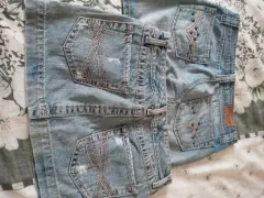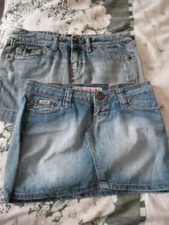 Minifaldas de mezclilla,se abrochan enfrente y tienen bolsas frontales, se van las dos juntas