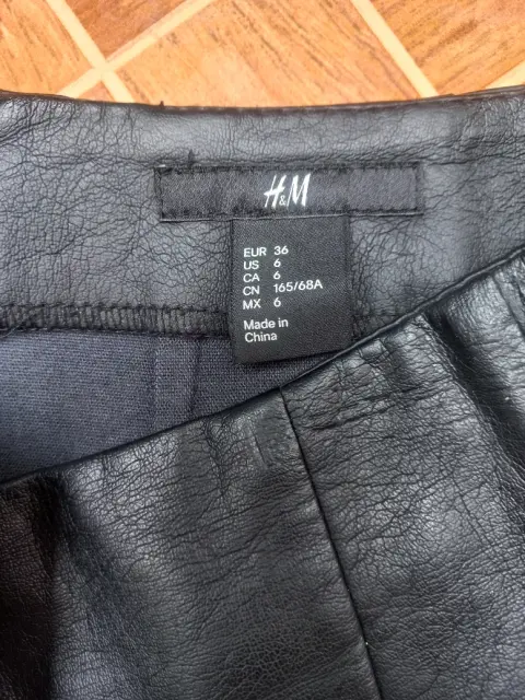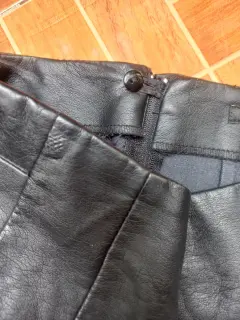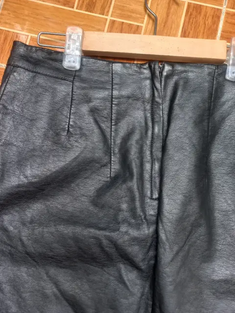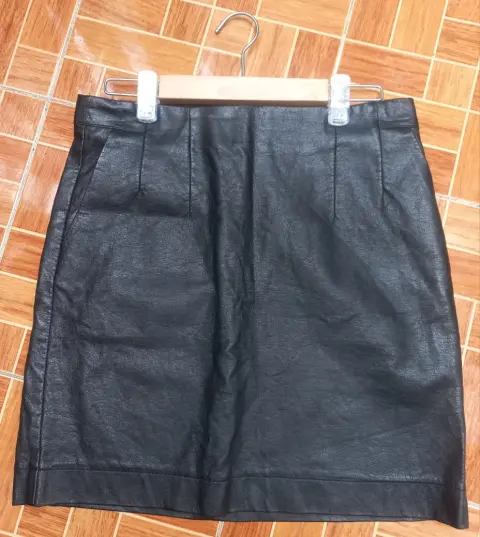 Talla SEs de piel sintética con bolsas a los costados, el forro de las bolsas es 100% poliester. Cierre en la parte trasera con botón de seguridad. Tiene pinzas doble adelante y atrás.Medida cintura 77cm.Medida cadera 89cm.Largo falda 43cm.