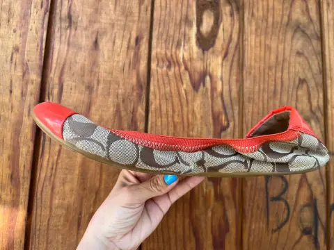 Balerinas Flats flexibles coach color Beige , café y naranjas . Número 25.5 tienen detalles de uso a un costado de una de las balerinas , en la suela y en la parte de atrás desgastes ligeros aún son muy útiles (detalles últimas fotos )
