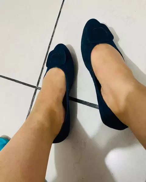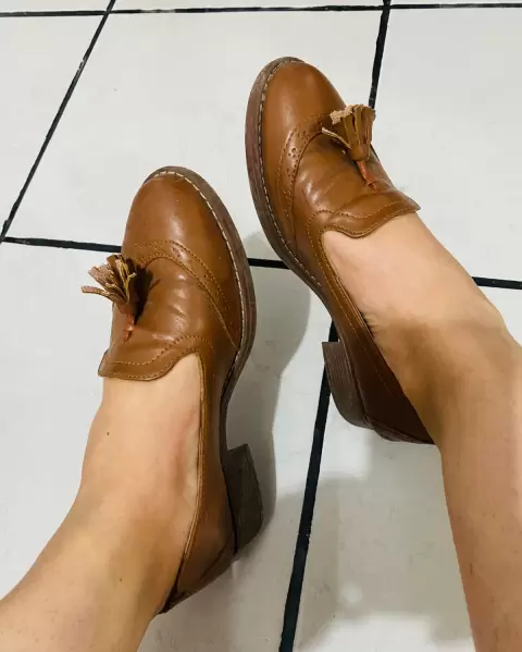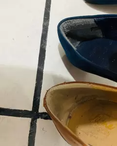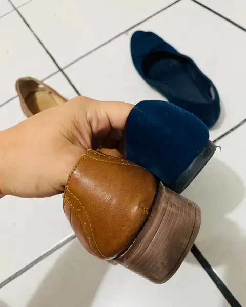 Dúo de Zapatos. Ambos son talla 4Los azul son lo de menos uso, si acaso 2 vecesPero ambos son detalles , los camel un poco guanguitos de donde cuelga el adornoambos se ven aplastados por estar guardados por años.