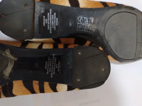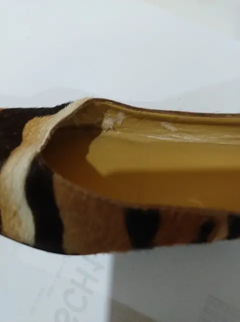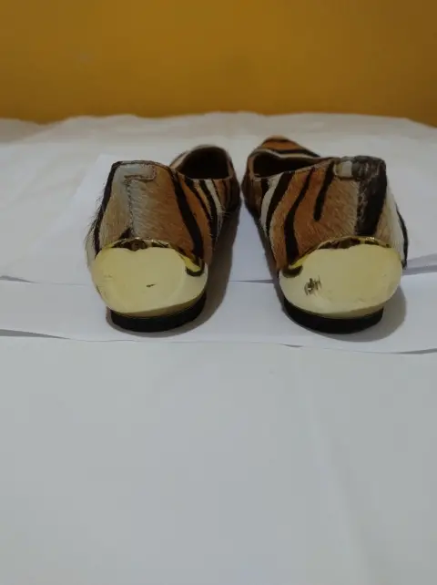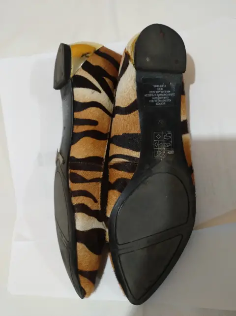 Flats en corte bovino con acabado de pelaje sintético, placa dorada en la parte de atrás, suela sintética. En general en buenas condiciones ya que tuvieron pocas puestasNo. 6 (equivalente a un 3 mexicano) fiel a su tallaDetalles de uso: Manchas/raspaduras en la placa dorada, comienza a mostrar desgaste en el forro (últimas fotos)