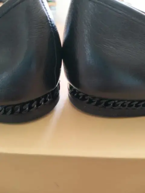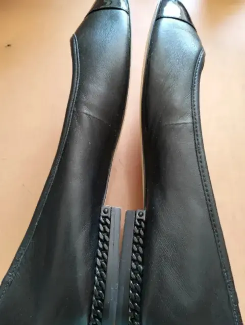 FLATS NEGROS CON PUNTA DE CHAROL. Bonitos FLATS negros con punta de charol de piel y suela de cuero tacón con adornos de cadena