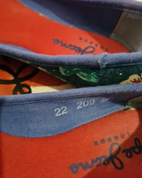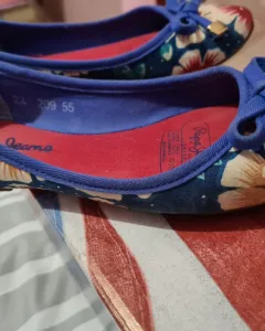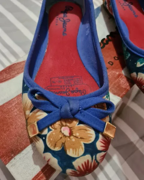 Flats pepe jeans. Flats de tela tipo algodòn con estampado de flores, azul rey es el color predominante, talla 22 mexicano, viene fiel a su talla.