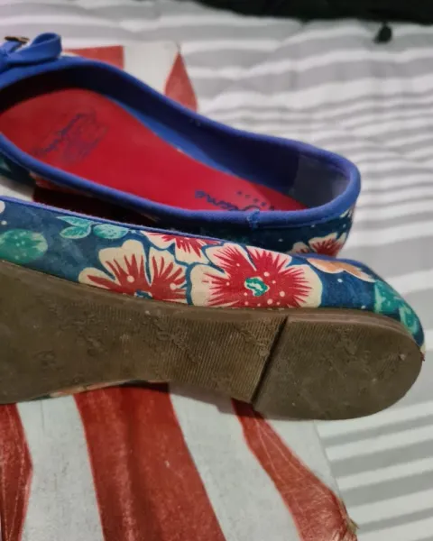 Flats de tela tipo algodòn con estampado de flores, azul rey es el color predominante, talla 22 mexicano, viene fiel a su talla.