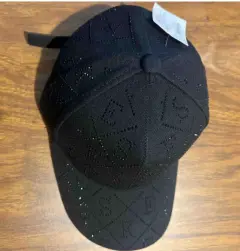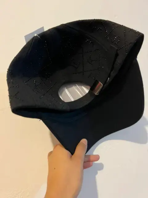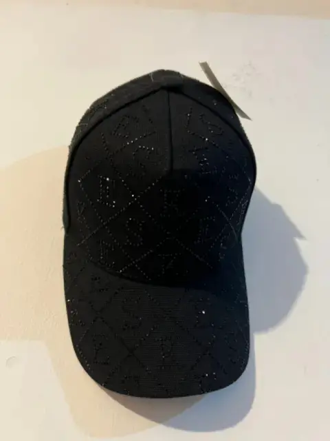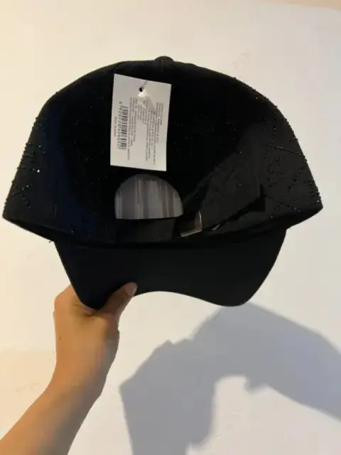 Hermosa gorra color negra, con aplicación de brillos en color negro .Ajustable por la parte de atrás por medio de un broche tipo cinturón .Unitalla .Nueva con etiqueta