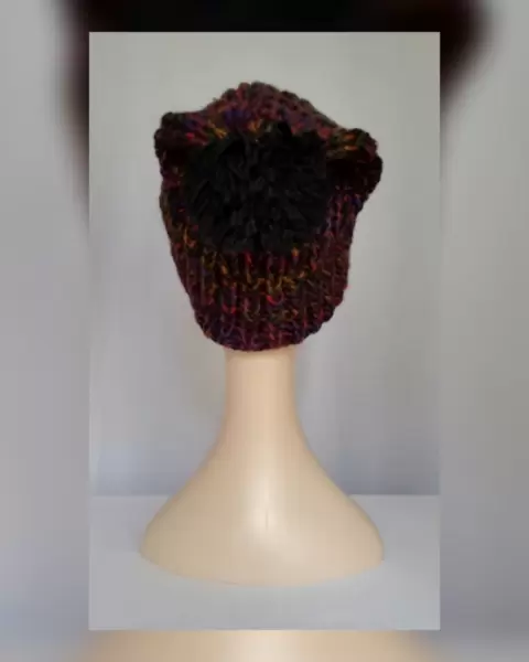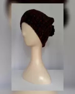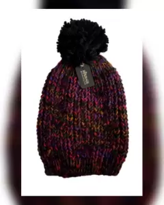 Gorro en tejido de punto con estructura MULTICOLOR en base negra y tonos morados, verdes, grises, cafés y rojos y pompón en contraste tono negro. Unitalla. 100% acrílico. Para lavado en casa.