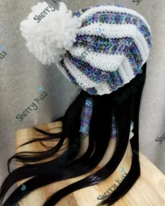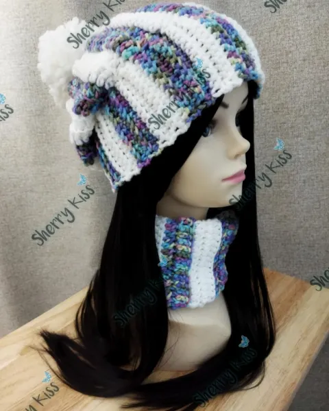 Conjunto de gorro y cuello tejido a mano en estambre matizado y blanco en franjas intercaladas. Con pompón hecho de estambre carola, no es peluche.Altura Gorro: 25 cms. aprox.Altura Cuello: 22 cms. aprox.Gracias por tu tiempo!