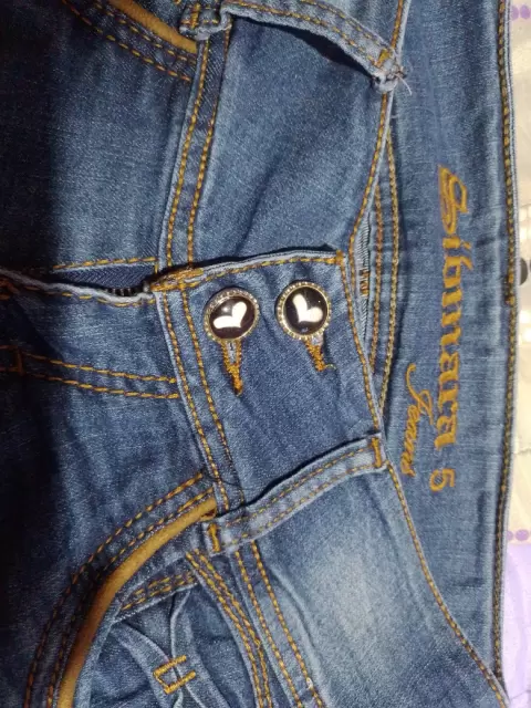 Rasgado con pedrería de fantasía color dorado Color del pantalon azul deslavado Talla 5 a la cadera