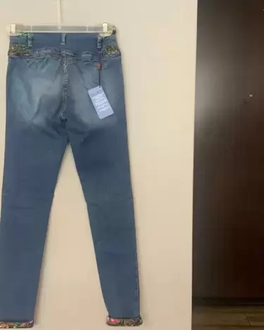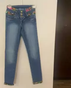 Bonito Jeans color azul, sin bolsas, atrech y estampado flores, entubado, cadera baja talla 7, de regalo body blanco que se ve en la foto