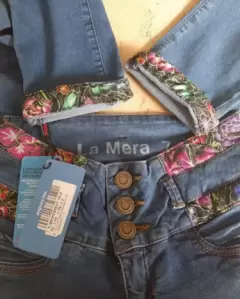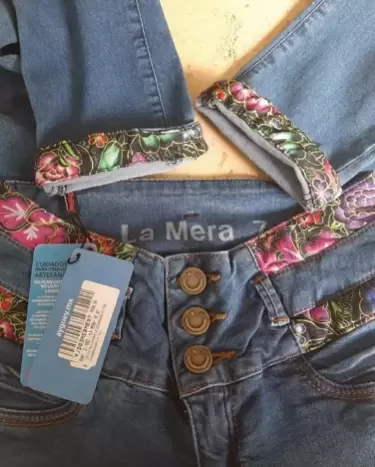 Jeans Ay Güey con estampado de flores. Bonito Jeans color azul, sin bolsas, atrech y estampado flores, entubado, cadera baja talla 7, de regalo body blanco que se ve en la foto