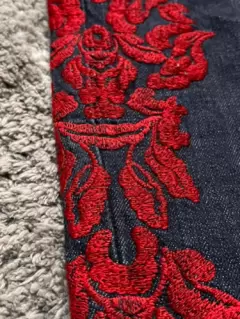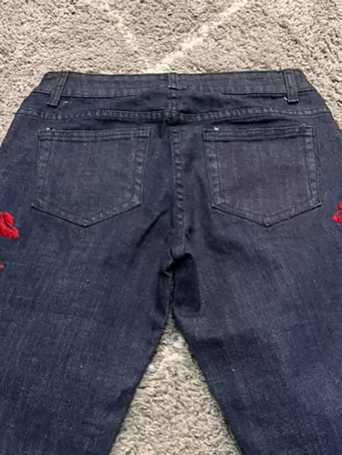 Jeans con aplique. Hermosos pantalones de mezclilla con aplique rojo en ambos costados de la pierna. Medidas cintura 36 cm, cadera 46 cm, largo 100 cm