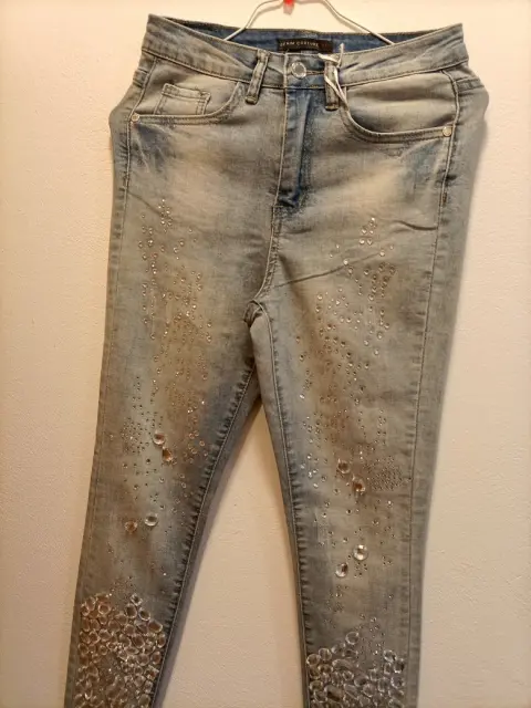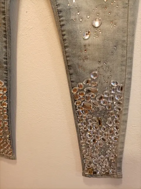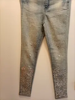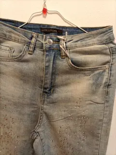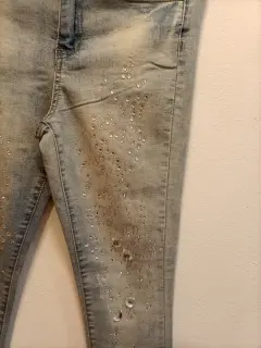 JEANS CON PEDRERÍA. Hermosos jeans con pedrería bordada ,super en tendencia , entallados y entubados,resaltan cualquier look.talla S 28.
