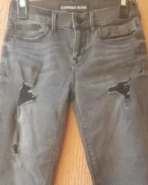 Jeans destroyed Express. Bonito pantalón en color gris avejentado, conrasgados localizados cintura media, con bastantestretch*Talla 0R pero puede quedar como a 3-5 ya que estira mucho*Medidas: Cintura 34cm. Cadera 41cm*Sin detalles*Calificación: 10*