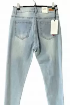 Jeans Strech a la cintura, deslavado talla-7 con bolsas traseras y cierres en costado de tobillos,