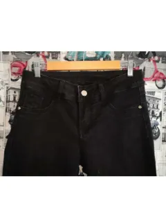 Pantalón de mezclilla negro, cintura media, acampanado. Bolsas frontales de adorno. Corte levanta pompa.