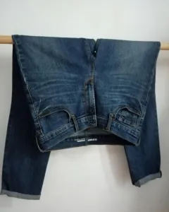 Jeans de cinco bolsas, trabillas para cinturón, bajo con doblez, en perfectas condiciones.