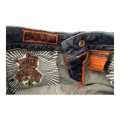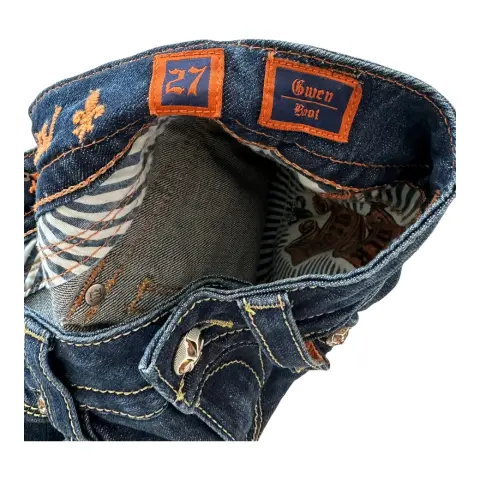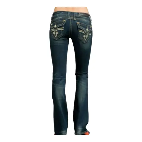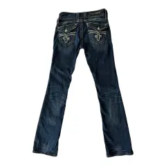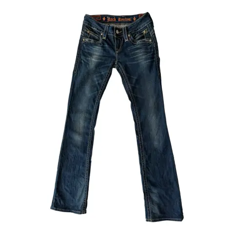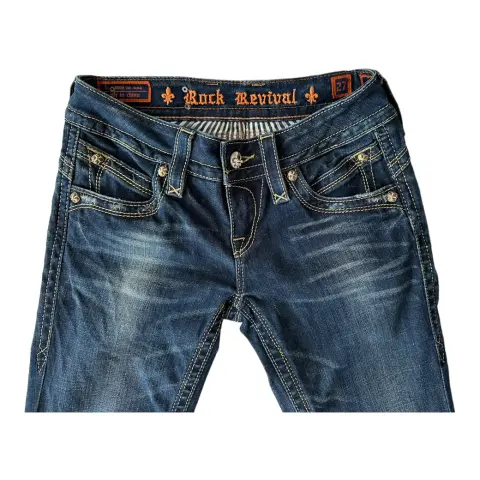 Jeans rectos rock revival. Jeans corte recto, ajuste a la cadera, tiro bajo, no es stretch, bootcut.Talla: 27Medidas: 35 cm cintura, 39 cm cadera, 19 cm tiro y 88 cm entrepierna.
