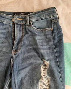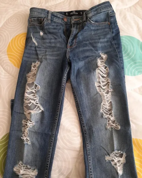Jeans rotos entubado. Jeans azul con detalles de rojo. Tiro alto y entubado. Queda a 30 -32 en talla mexicana