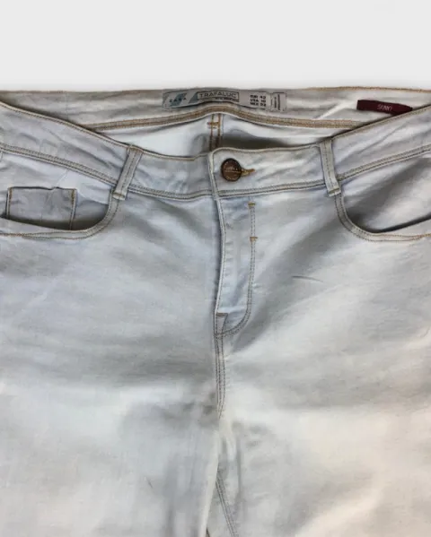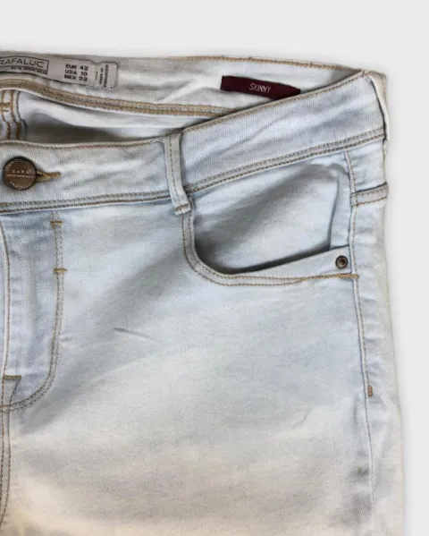 Jeans Skinny Zara Trafaluc. Jeans de la colección Trafaluc de Zara, en tono azul claro y costuras en amarillo, talla 32 / M están súper padres.