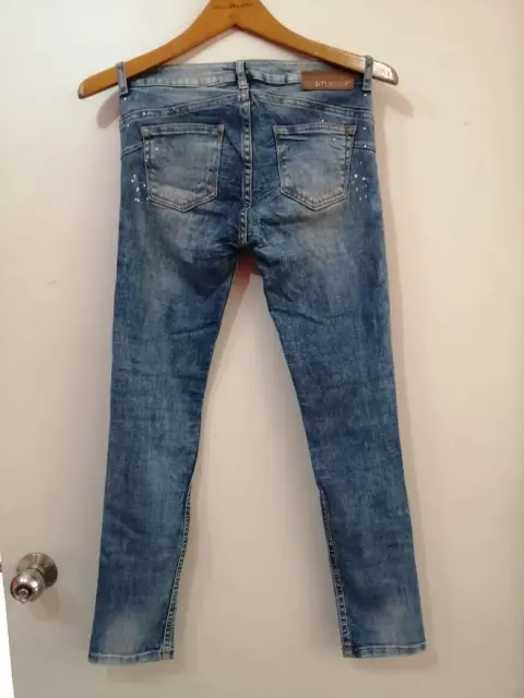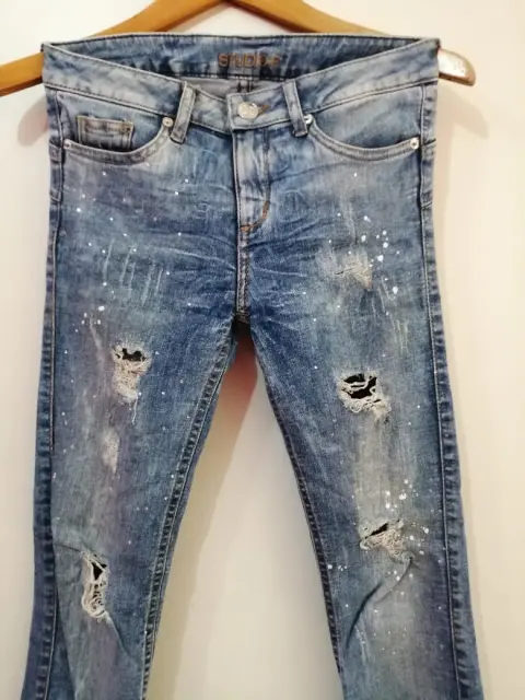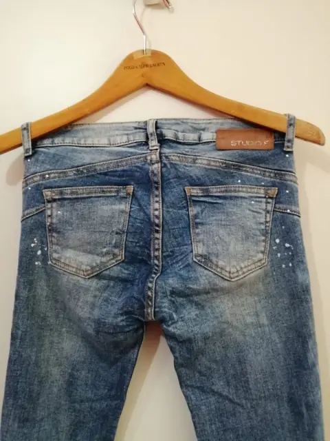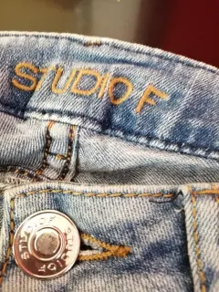 Jeans studio F. Padrísimos jeans con tiro bajo, lo pintado y roto es parte de el diseño, tiene brillos pequeños, push up colombiano amolda muy padre, talla 24