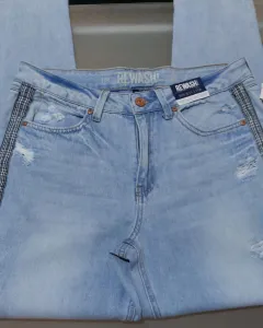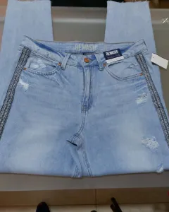 Jeans a la cintura tipo vintage rotos, con línea a los costados nuevo con etiqueta color azul clarito talla 11 strech entubados