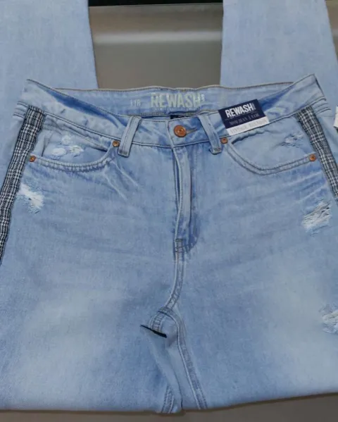 Jeans tipo vintage. Jeans a la cintura tipo vintage rotos, con línea a los costados nuevo con etiqueta color azul clarito talla 11 strech entubados