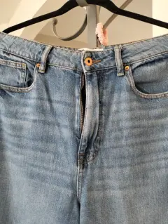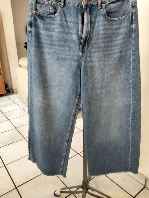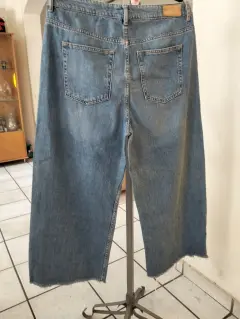 JEANS WIDE LEG. Jeans para de elefante de mezclilla deslavadas de botón con bolsas delanteras y traseras piernas deshiladas así es el modelo