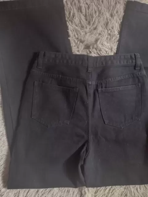 Jeans wide leg negros. Jeans de pierna ancha Shein, color negro, talla M. De tiro alto y mezclilla sin stretch. Por la luz se ven más claros, pero son negro intenso (no deslavado) Totalmente nuevos.📌Medidas aprox: Cintura 37 cm, cadera 50 cm, tiro 31 cm, largo 108 cm.