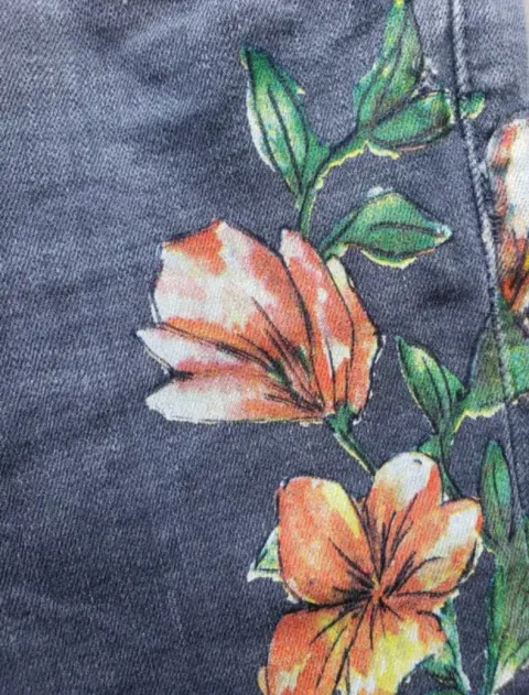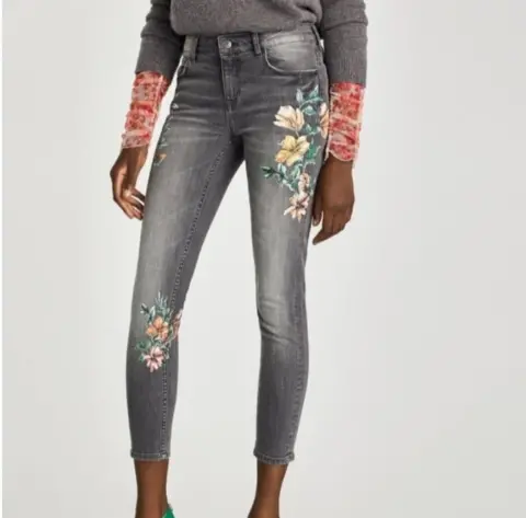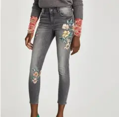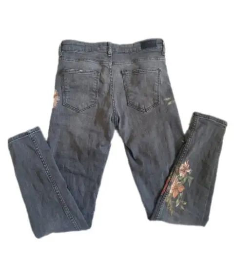 Pantalón denim Zara color gris con flores, talla 24 mx, nuevo sin etiqueta, corte skinny.