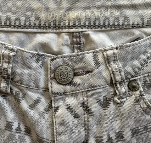 Jegging Aéropostale. Jegging blanco con diferentes tonos de grises.Ajuste a la cadera, tiro bajo, bolsillos delanteros y traseros.Talla: 0 o XSMedidas: 33 cm de cintura, 38.5 cm de cadera, 17 cm de tiro y 74 cm de entrepierna.
